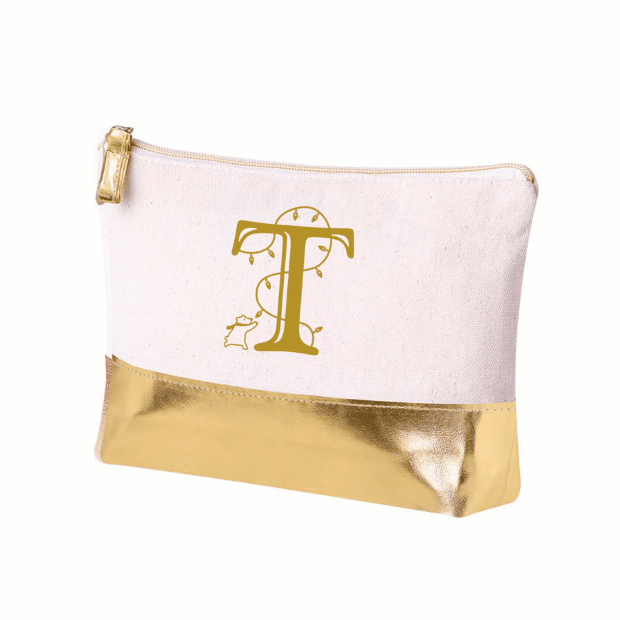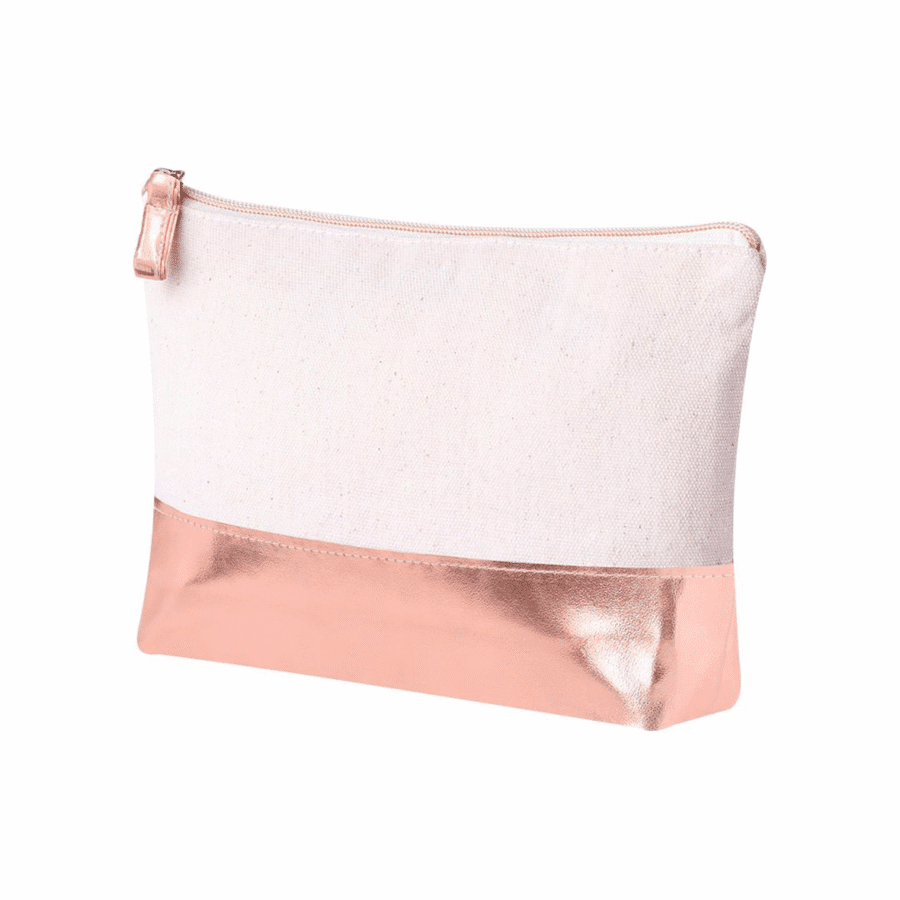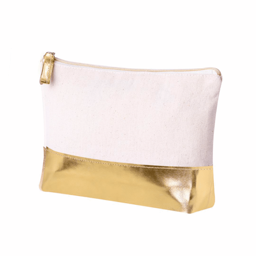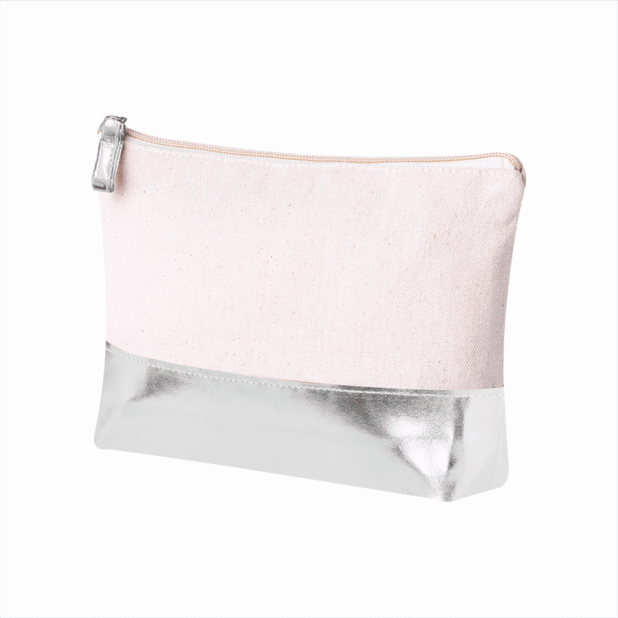 Neceser en algodón reciclado de 220 g/m2. Con cierre de cremallera a juego con la base. Disponible en color natural con base de color metalizado en polipiel.